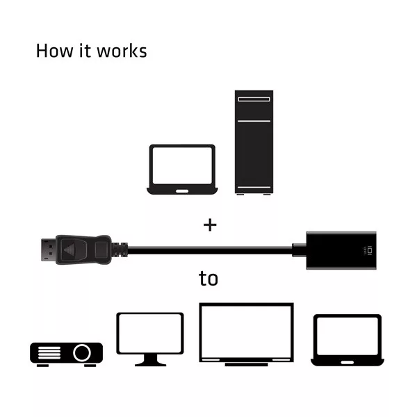 Arra szolgál, hogy egy DisplayPort 1.4 kimenettel rendelkező számítógépet vagy más forrást HDMI 2.0b bemenetű kijelzőhöz csatlakoztass. Tipikus felhasználás: PC vagy munkaállomás összekötése HDMI-s monitorral, televízióval vagy projektorral.