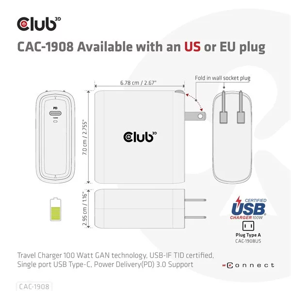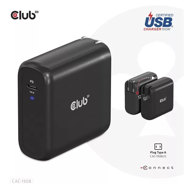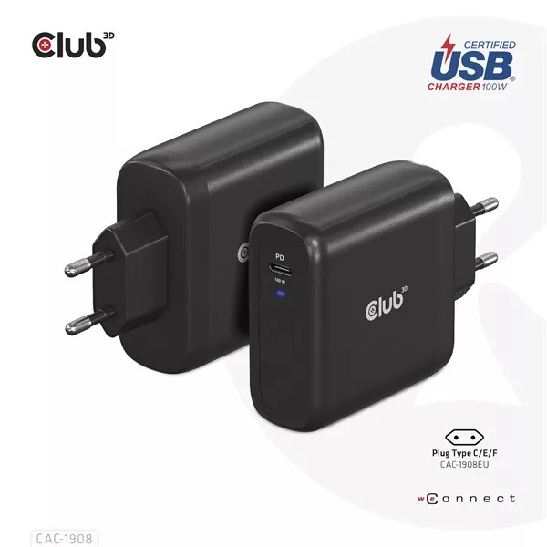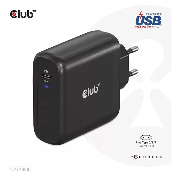 Club 3D Hálózati töltő - CAC-1908EU (100W GAN, USB-IF, egyportos USB-C, PD 3.0 támogatás)