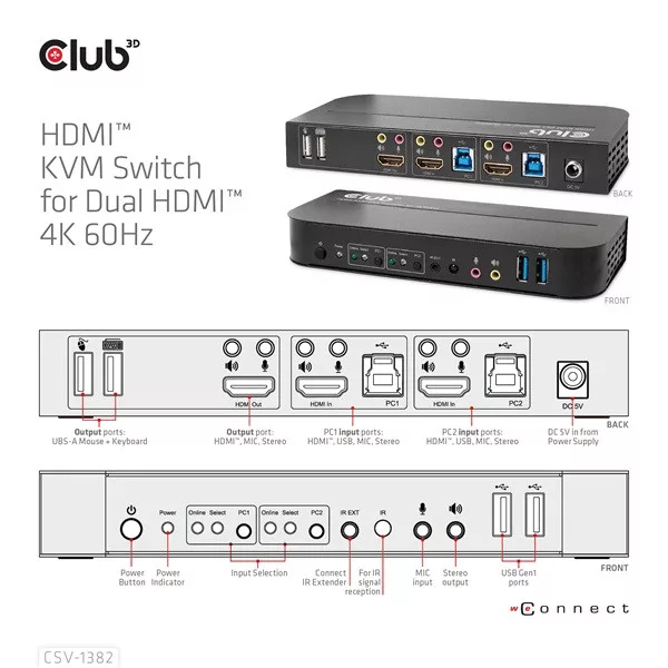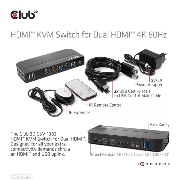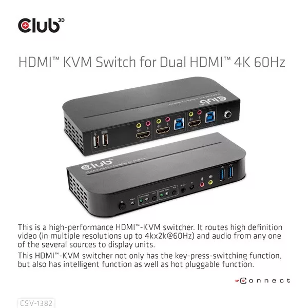Club 3D KVM Switch CSV-1382 dual HDMI 4K60Hz kapcsoláshoz