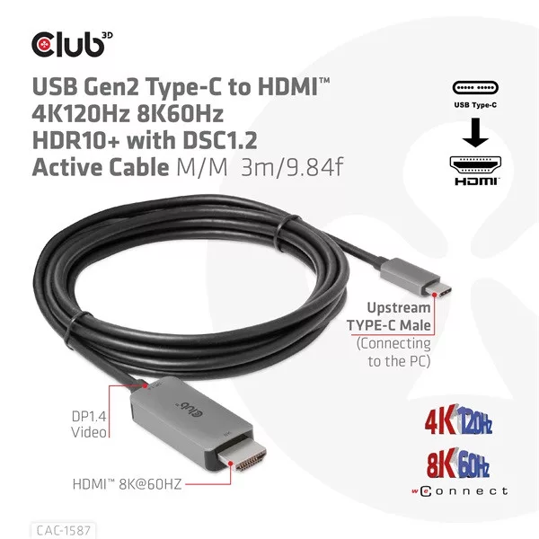 Club 3D CAC-1587 USB-C Gen 2 to HDMI kábel 4K120Hz 8K60Hz