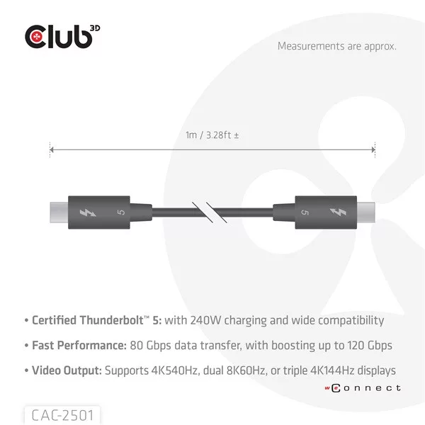 Club 3D Kábel - CAC-2501 (Thunderbolt 5 USB-C to USB-C, 240W, 80/120 Gbps, EPR, 8K240Hz, 1m)