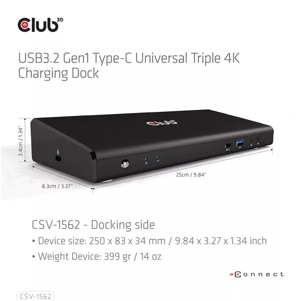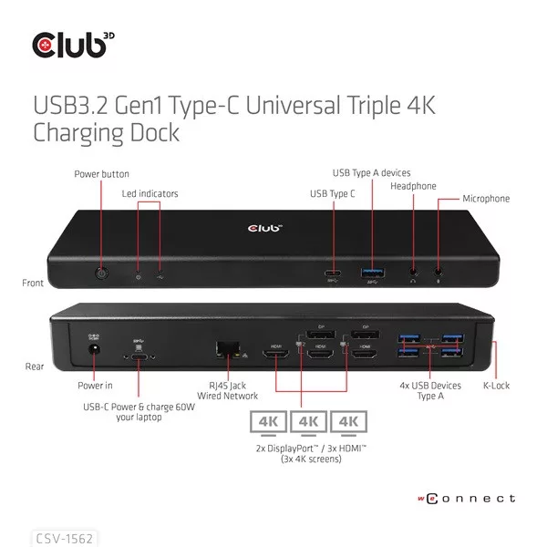 A CSV-1562 egy USB3.2 Gen1 Type-C univerzális háromszoros 4K töltő dokkoló állomás. Az univerzális töltődokkolót úgy tervezték, hogy megfeleljen a legsokoldalúbb csatlakozási igényeinek. Az USB 3.2 Gen1 interfész akár 5 Gbps sávszélességet is támogat, ami lehetővé teszi, hogy élvezze a szupergyors adatátvitelt kedvenc USB-perifériái között, és akár 2x külső 4K60Hz-es kijelzőt és 1x4K30Hz-et is lehetővé tesz egyidejűleg (a forrásból DP™ Alt mód támogatása szükséges), emellett vezetékes hálózati csatlakozást és Gbps-t is kínál. A PowerDelivery(PD) töltési technológia, az USB3.2 Gen1 Type-C interfészen keresztüli upstream töltési funkció alkalmazásával csatlakoztatott mobiltelefont / táblagépet / laptopot tölthet. Ezenkívül a hozzáadott Kensington Lock opció lehetővé teszi a dokkoló rögzítését is. Csak egy ingyenes USB 3.2 Gen 1 portra van szüksége laptopján vagy Ultrabookján, hogy egyetlen USB Type-C kábelen keresztül csatlakozhasson az univerzális három 4K töltődokkoláshoz.