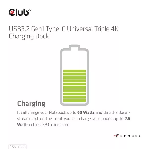A laptopok / UltraBooks / táblagépek gyakran korlátozott csatlakozási lehetőségekkel rendelkeznek. A PD Charging technológia és az USB Type C interfészen keresztüli upstream töltési funkció alkalmazásával a Club3D USB Type C töltődokkoló egyedülálló funkcionalitást kínál. Legfeljebb 85 Watttal tölti notebookját, az előlapi porton keresztül pedig akár 7,5 Watt is töltheti telefonját.