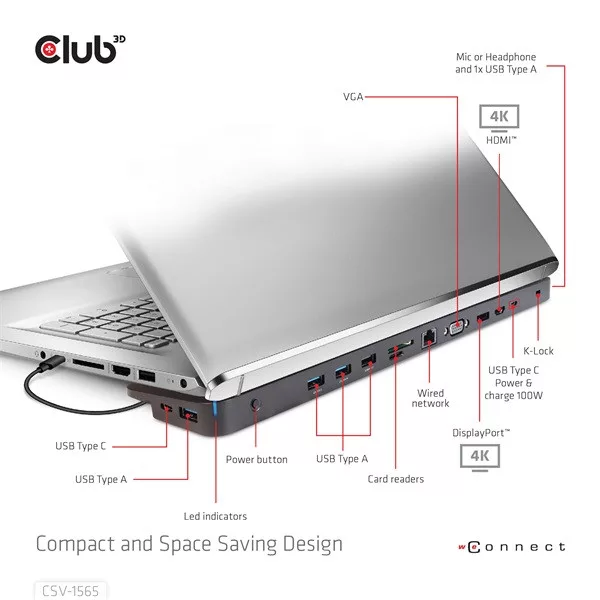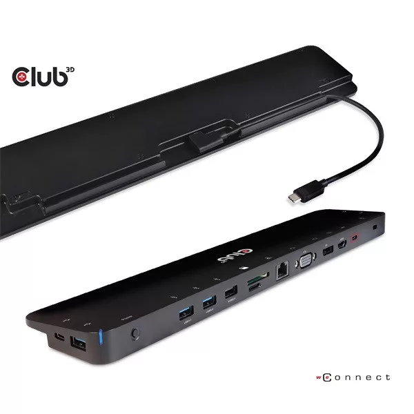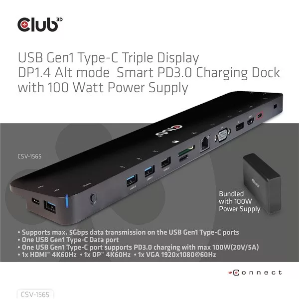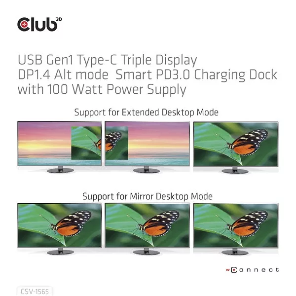 A Club-3D CSV-1565 USB Gen1 Type-C hármas kijelzős DP1.4 Alt módú Smart PD3.0 töltődokkoló egy integrált megoldás, amely egyesíti a videót, adatot, tápellátást, Ethernetet és hangot, különösen a gyakran utazók számára. A három különböző videoport (HDMI™, DisplayPort™, VGA) lehetővé teszi, hogy 3 különböző képet (1x HDMI™ 4K60Hz vagy 1x DP™ 4K60Hz vagy 1x VGA 1920x1080@60Hz) vagy videókat 3 különböző kijelzőn élvezhessen (1x 4K30Hz@p60ST80+2x10Hz mód) egyidejűleg. Az USB Type-A portok és USB Type-C adatport lehetővé teszik több USB-eszköz csatlakoztatását a gazdagéphez. Az USB Type-C töltőport lehetővé teszi, hogy tápellátást biztosítson ehhez a dokkolóhoz, és egy PD3.0 tápadapter csatlakoztatásával egyidejűleg töltheti a gazdaszámítógépet, nincs szükség a notebookok tápegységének cipelésére. Tehát általában a felhasználó könnyebben utazik. A Micro SD és SD/MMC portok lehetővé teszik a memóriakártyán lévő információk beolvasását a gazdagépre. A 3,5 mm-es audioport lehetővé teszi a gazdagép zenéjének a fülhallgatón keresztüli élvezetét. Ezenkívül a Gigabit Ethernet porttal nagy sebességű Ethernetet élvezhet a gazdagépen. Támogatja az összes DP1.4 Alt móddal támogatott gazdagépet. (PC, Laptop, Mobiltelefon, stb.) Dinamikus áramészlelés és áramelosztás, a termék már nem a külső PD3.0 tápegység fix tápellátását, hanem saját maga által ténylegesen fogyasztott áramfelvétele szerint fogja le, így a PC dinamikusan több energiát tölthet fel. Videojelhez a forráseszköznek támogatnia kell a DisplayPort™1.4 Alt módot.