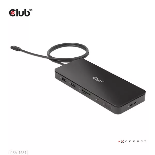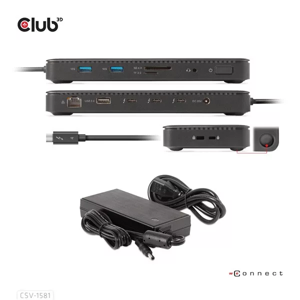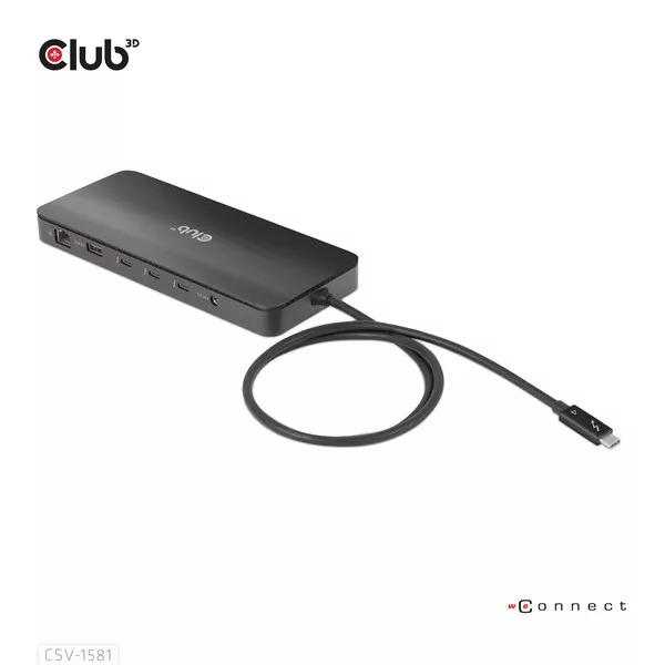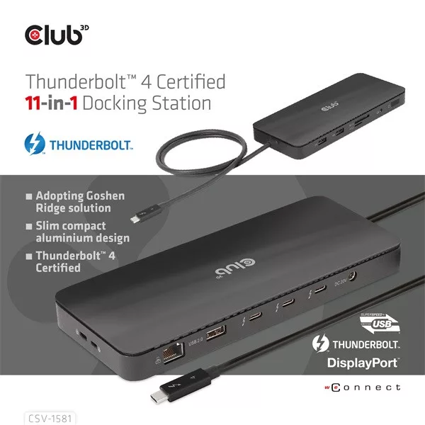 A Club 3D CSV-1581 egy tanúsítvánnyal rendelkező Thunderbolt™ 4 11 az 1-ben dokkolóállomás, amely a legfejlettebb, leghatékonyabb és legsokoldalúbb I/O megoldást kínálja akár 40 Gb/s adat- és videóátviteli sebességgel. Lehetővé teszi egy 8K30Hz-es vagy két 4K60Hz-es monitor csatlakoztatását. A dokkoló támogatja az intelligens tápellátás funkciót, amely lehetővé teszi az energia elosztását a csatlakoztatott eszköz energiafogyasztásának megfelelően, teljes mértékben kihasználva a külső tápegységet. Thunderbolt™ 4 alapú PC-khez és Thunderbolt™ 3 alapú Mac-ekhez tervezték, amelyek MacOS 11 és újabb verziókat használnak (CSAK M1 Pro- és Max Chip).