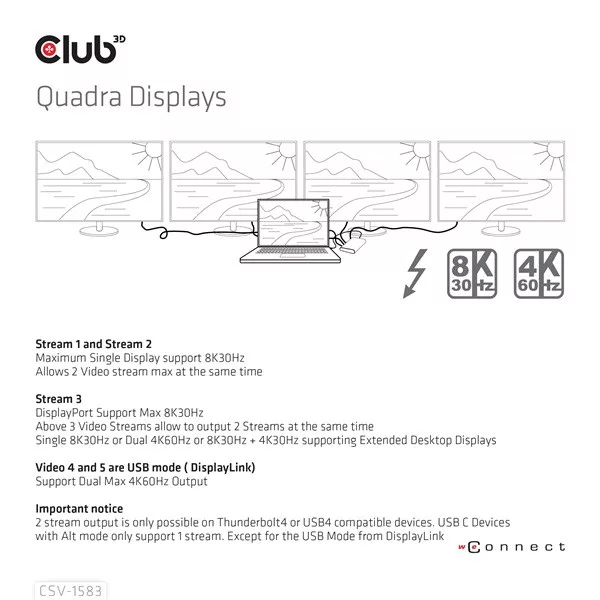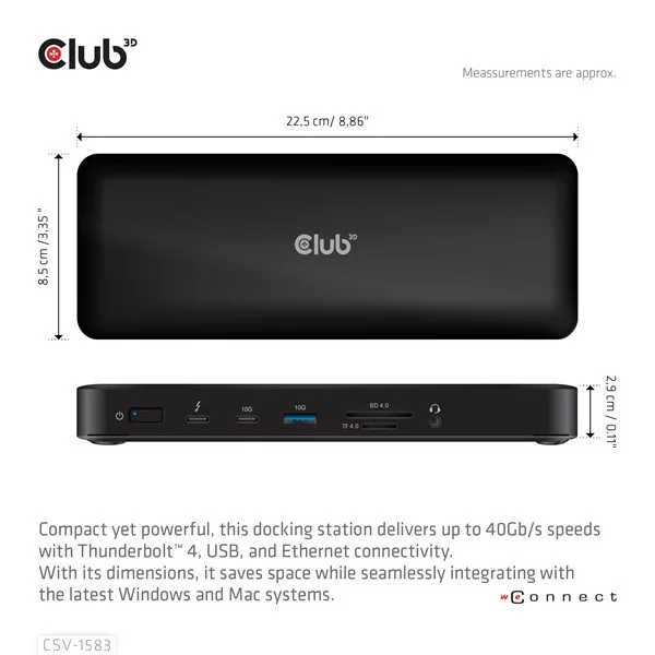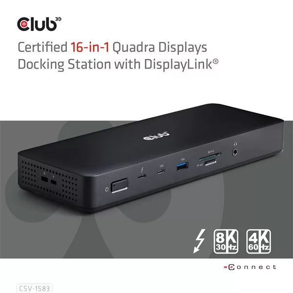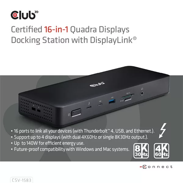 A Club 3D CSV-1583 egy Thunderbolt™ 4 tanúsítvánnyal rendelkező, 16 az 1-ben Quadra DisplayLink® dokkolóállomás, amely a legfejlettebb, leghatékonyabb és legsokoldalúbb I/O megoldást kínálja akár 40 Gb/s adat- és videóátviteli sebességgel. Mind a 7 videoport közül maximum 3 videó kimenetét teszi lehetővé, ha M1, M2 és M3 csatlakozókhoz csatlakozik; 4 videó M1 Pro/Max, M2 Pro/Max, M3 Pro/Max és más Mac sorozatú notebookokhoz és Windows notebookokhoz csatlakoztatva. Az RJ45 legfeljebb 2,5 G sávszélességet támogat. Az USB portok maximum 10G adatátvitelt támogatnak. Emellett támogatja az intelligens tápellátás funkciót, amely lehetővé teszi a teljesítmény elosztását a csatlakoztatott eszköz energiafogyasztásának megfelelően, teljes mértékben kihasználva a külső tápegységet. TBT4™/USB4™ alapú számítógépekhez tervezték, és kompatibilis a /DP-Alt módú PC-kkel.