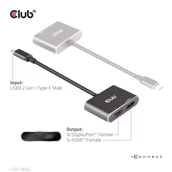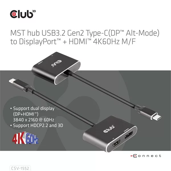 Két külső kijelzőt kötnél egyetlen USB-C csatlakozóról, kompromisszumok nélkül? A Club 3D USB Hub - CSV-1552 kifejezetten olyan notebookokhoz, tabletekhez és kompatibilis telefonokhoz készült, amelyek támogatják a USB-C DP Alt Mode kapcsolatot, és szükség van egyidejű DisplayPort + HDMI képkimenetre akár 4K60Hz felbontással.