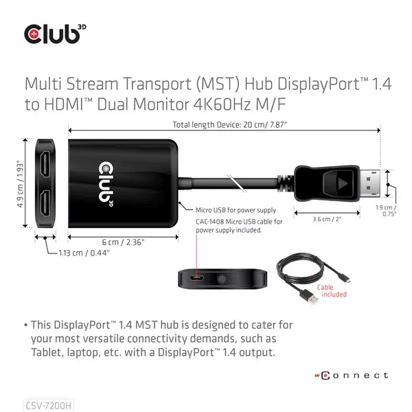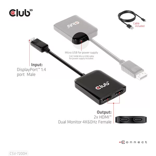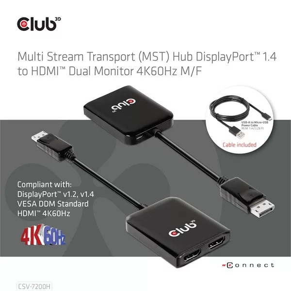 Club 3D CSV-7200H DisplayPort 1.4 to 2xHDMI 2x4K60Hz MST hub