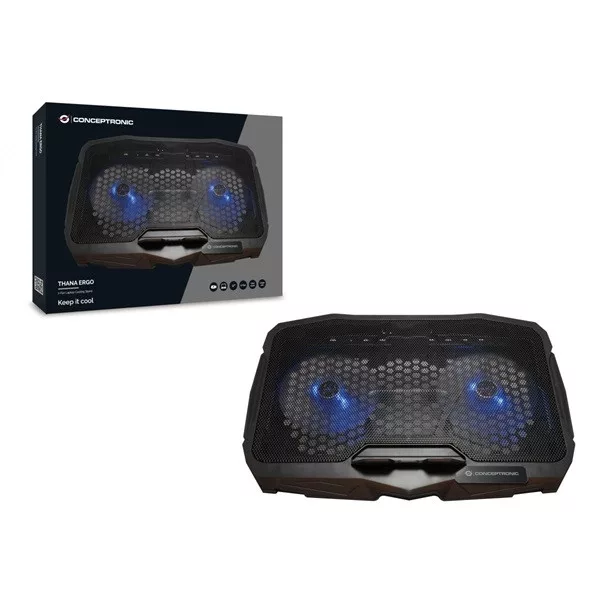 The Conceptronic notebook cooling pad will maintain safe and comfortable running of your portable device, using 2 quiet yet powerful fans. The cooling pad is USB powered, so it can work anywhere without the need for a power socket. The pad is cleverly designed with a groove for your USB chord, to avoid the wire becoming tangled and getting damaged. The cooling pad features an anti-slip design to make sure the device remains centrally located on the pad. A handy and versatile addition to mobile work and play.