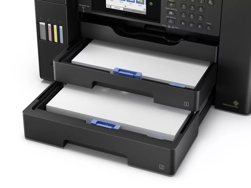 A Epson külső tintatartályos EcoTank rendszere alacsony üzemeltetési költséget kínál, miközben a készülék támogatja a kétoldalas nyomtatást, az automatikus lapadagolást, valamint a Wi-Fi, LAN és USB kapcsolódást. Ha fontos a nagy papírkapacitás, az A3-as dokumentumkezelés és a kiszámítható irodai teljesítmény, ez a modell erős választás.