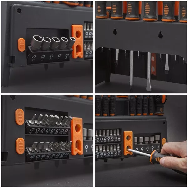 Átlátható tárolás állvánnyalAz állvány segít rendben tartani a szerszámokat, így gyorsabban megtalálható a megfelelő csavarhúzó vagy bit. Ez különösen hasznos, ha gyakran nyúlsz a készlethez otthon, a műhelyben vagy irodai karbantartás során.