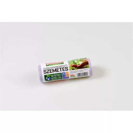 Azt, hogy a zsák alapanyaga korábban már feldolgozott műanyagból származik. Ez a megoldás hatékonyabban használja fel a meglévő műanyag erőforrásokat, miközben a termék továbbra is alkalmas a mindennapi hulladékgyűjtési feladatokra.
