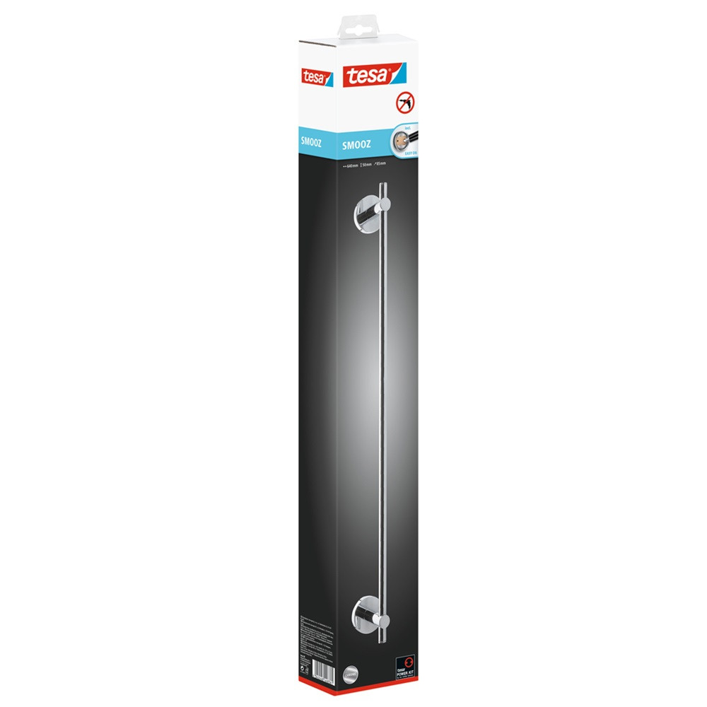 A Törölközőtartó rúd Smooz Tesa egyik legnagyobb előnye, hogy nem kell hozzá falat vagy csempét fúrni. Ez különösen hasznos felújított fürdőszobában, bérleményben vagy ott, ahol fontos a felület megóvása.