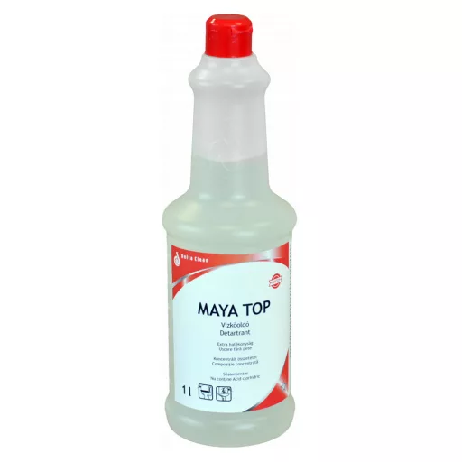 A vízkőoldó foszforsavas 1 liter Maya Top elsősorban vízkő és makacs szennyeződések eltávolítására való. Jól alkalmazható fürdőszobai és mellékhelyiségi felületeken, például mosdón, WC-n, fajanszon, porcelánon és saválló csempén.