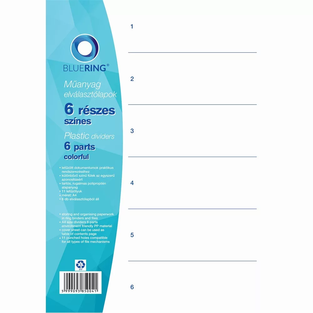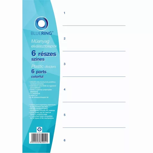 Elválasztólap, színes műanyag 6 részes Bluering®