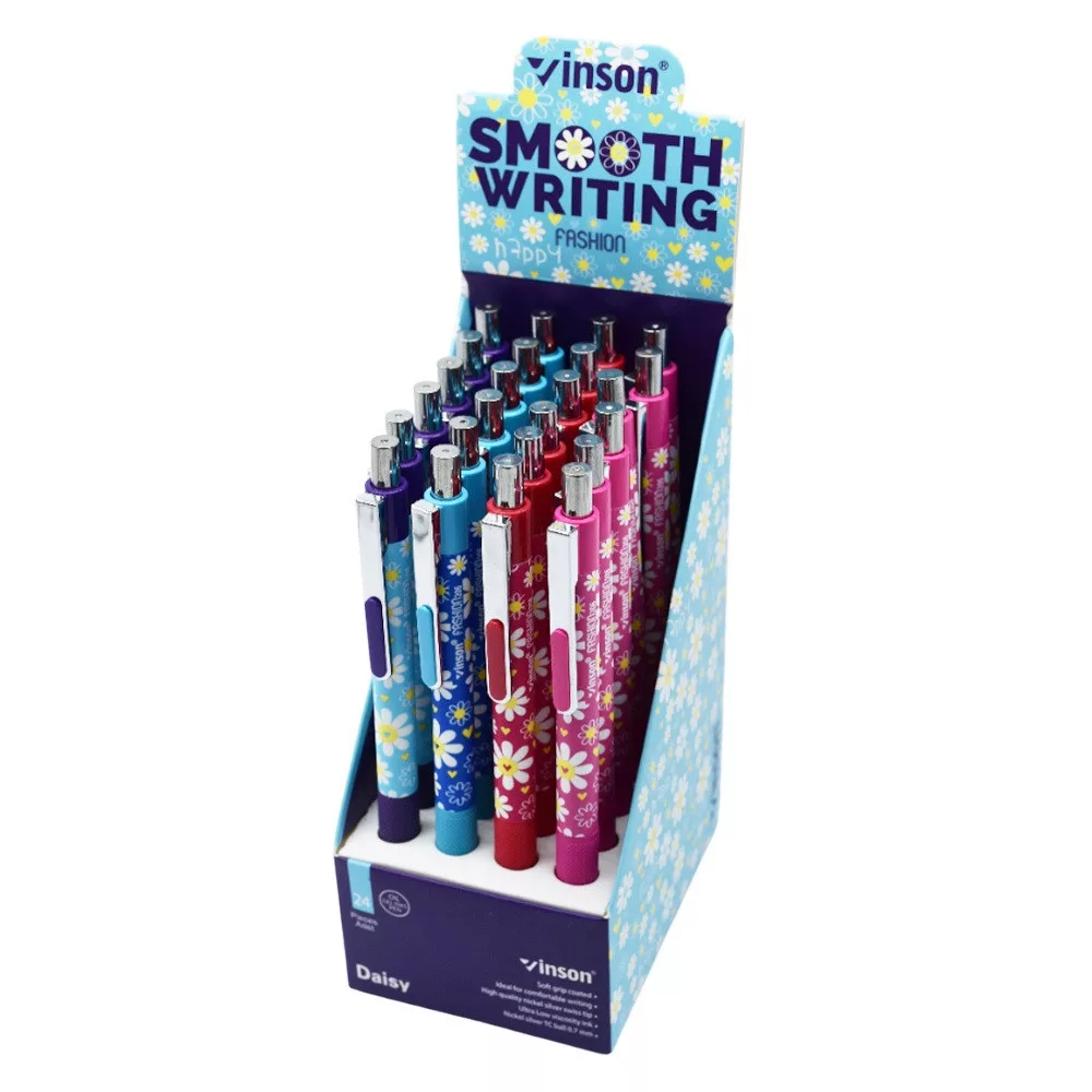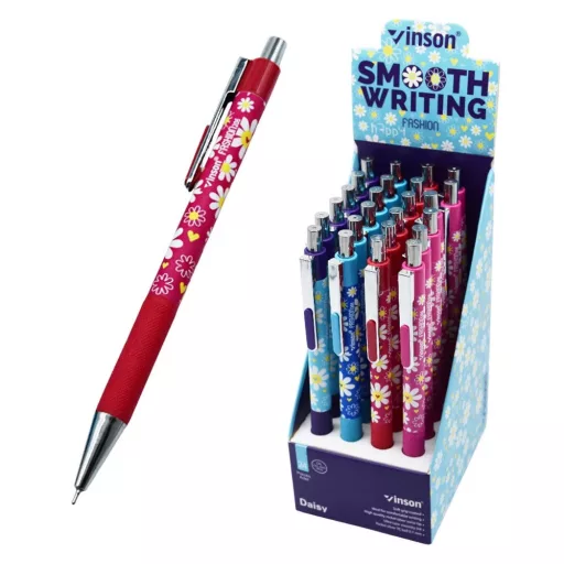 Golyóstoll nyomógombos 0,7mm Vinson Daisy 206 vegyes test displ 24 db/display – A Golyóstoll nyomógombos 0,7mm Vinson Daisy 206 vegyes test displ 24 db/display kényelmes, tartós tollmegoldás, amely gördülékeny írást biztosít.