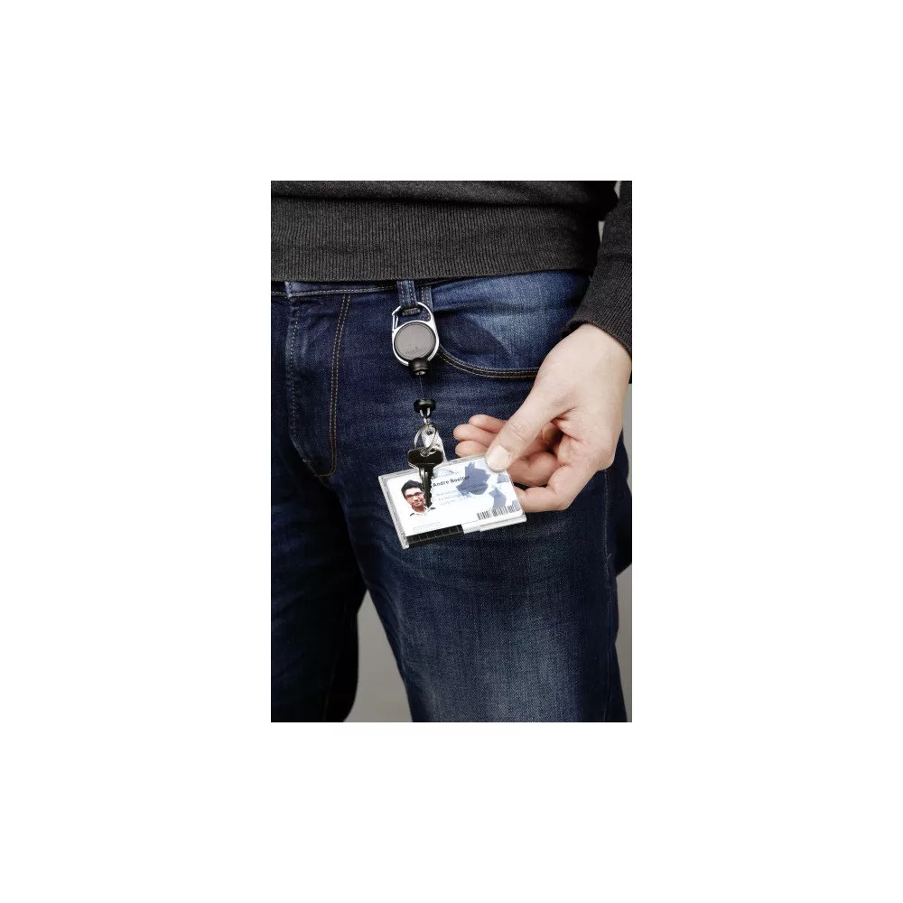 A 300 g-ig terhelhető Durable Extra Strong tartó nemcsak könnyű azonosítókhoz, hanem kulcsokhoz vagy nehezebb kártyatartó összeállításokhoz is használható. Ez különbséget jelent ott, ahol a hagyományos kihúzható tartók gyorsan elfáradnak.