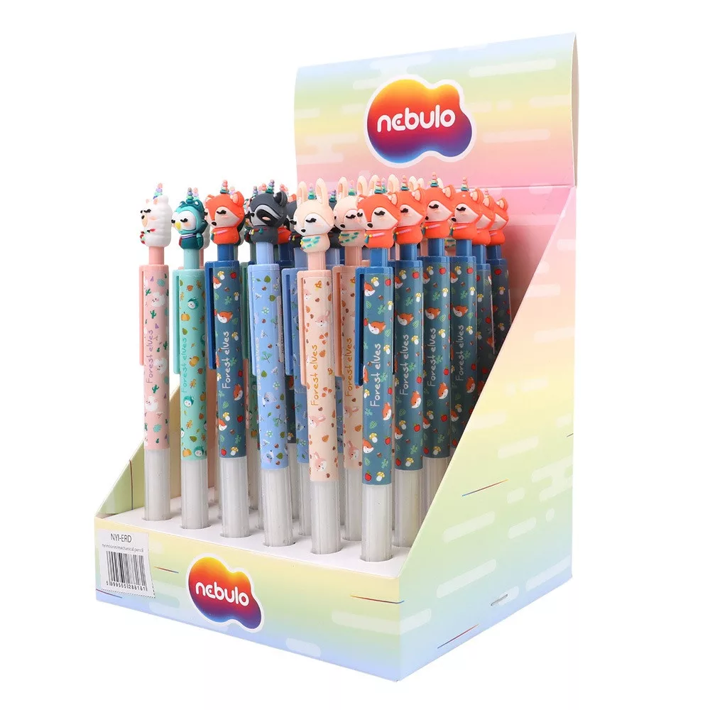 A 36 darabos display kiszerelésű Nebulo nyomósirón erdei állatos mintáival kifejezetten vonzó lehet gyermekek számára. A nyomógombos mechanika egyszerű használatot ad, a dekoratív külső pedig játékosabbá teszi a mindennapi írást, rajzolást és az iskolakezdést.