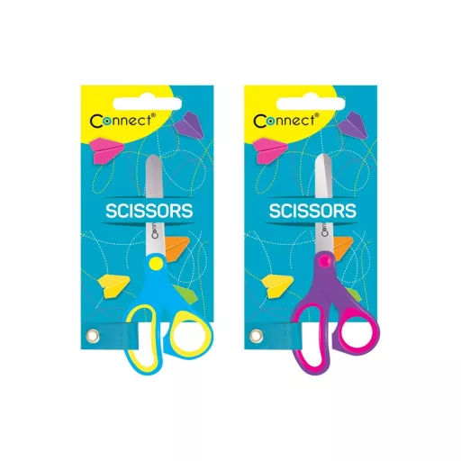 Olló 13 cm, iskolai gumírozott fogóval, felakasztható csomagolásban Connect