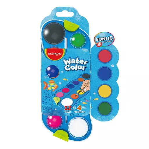 Vízfesték készlet, 12+4 cserélhető színnel, ecsettel, műanyag dobozban, Keyroad