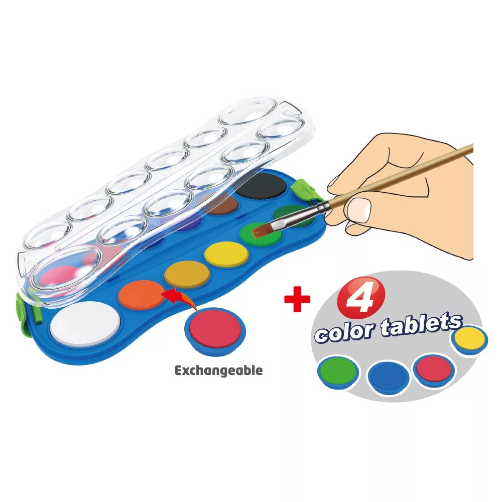 A 12 alapszín mellé 4 további cserélhető festékgomb kerül a készletbe, így árnyaltabb képek, színesebb iskolai munkák és kreatívabb rajzok készülhetnek ugyanazzal a palettával.