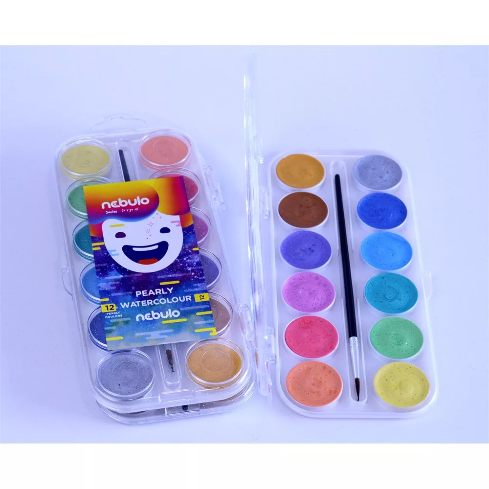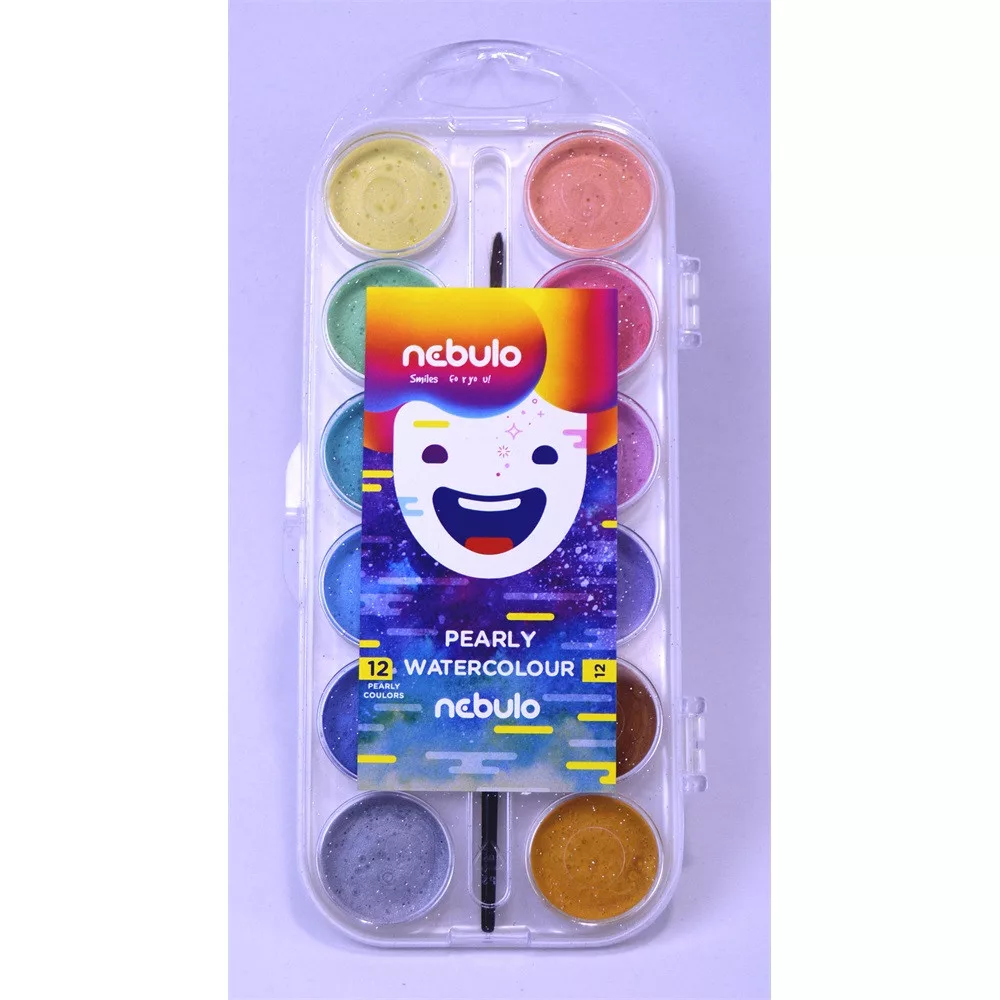 A Nebulo gyöngyházfényű 12 darabos vízfesték készlet nagy, 30 mm-es festékgombokkal készül, ezért kényelmesen használható iskolában, szakkörön vagy otthon. A készlethez ecset is tartozik, a műanyag doboz pedig segít rendezetten tárolni a színeket két használat között.